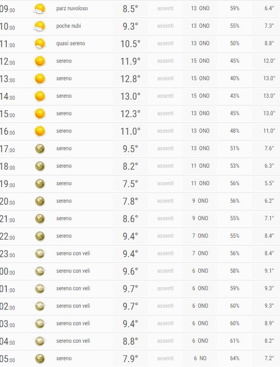 Al mattino Nubi sparse con ampie schiarite, al pomeriggio Sereno, la sera Sereno, la notte Sereno con innocue velature.