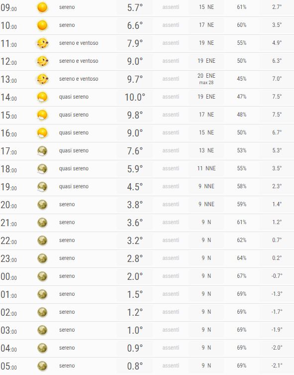 “A Siena oggi bel tempo con sole splendente per l’intera giornata, non sono previste piogge nelle prossime ore. Durante la giornata di oggi la temperatura massima registrata sarà di 10°C, la minima di 0.8°C, lo zero termico si attesterà a 1275m. I venti saranno al mattino deboli e proverranno da Nordest, al pomeriggio moderati e proverranno da Est-Nordest. Nessuna allerta meteo presente.