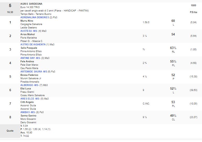 5^ Corsa Premio Agris Sardegna vinta da Adrenalina de Mores da Frac di Montalbo e Extra de Mores di proprietà di Ledda Gaetano e allenato da Cargiaghe Salvatore