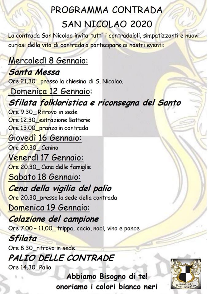 Ecco qua il programma delle attività di Contrada per il Palio nel periodo 08-19/01