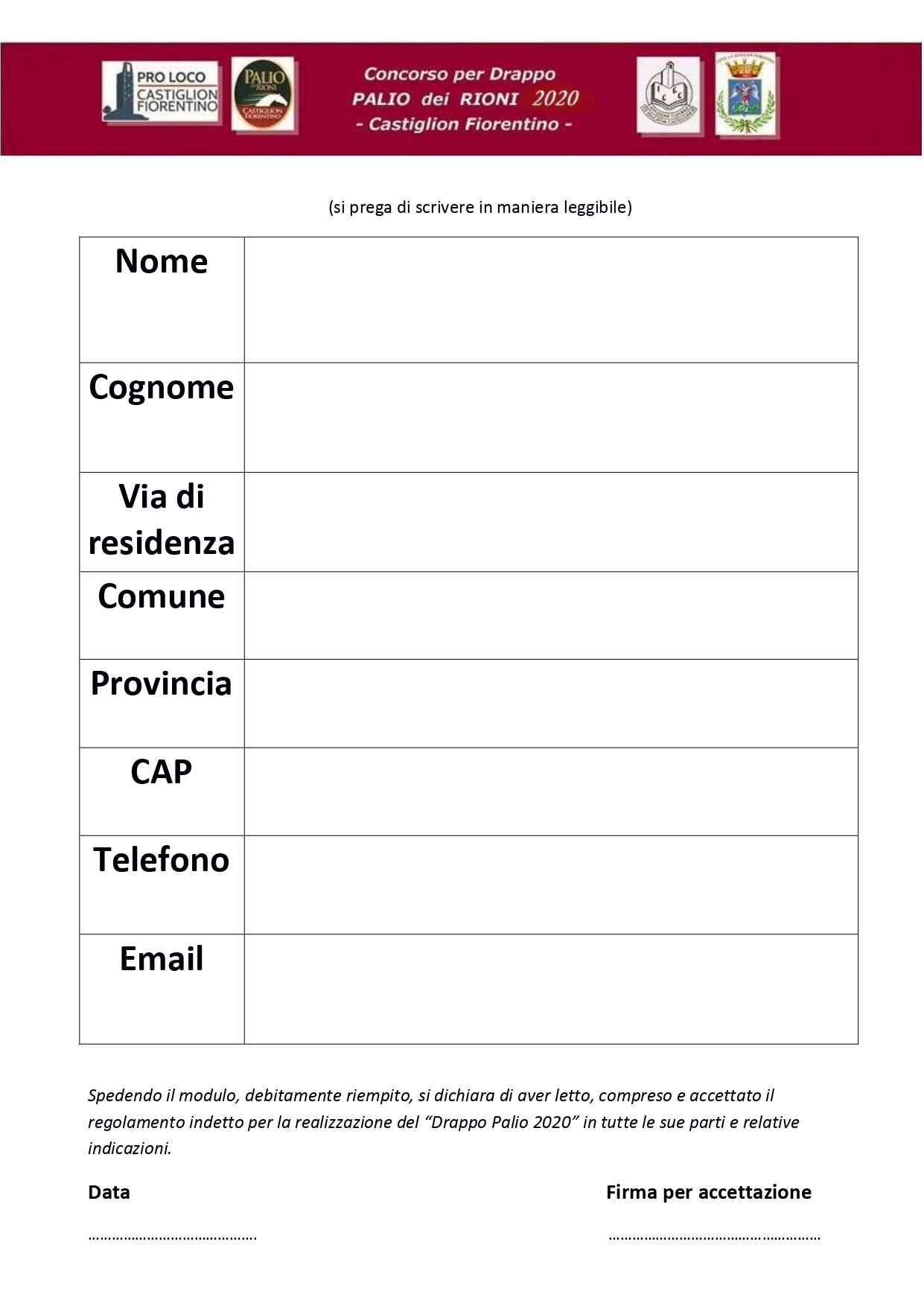 - Il Concorso è rivolto a tutti coloro che abbiano compiuto il diciottesimo anno d’età entro il 20 febbraio dell’anno corrente della corsa del Palio dei Rioni.
