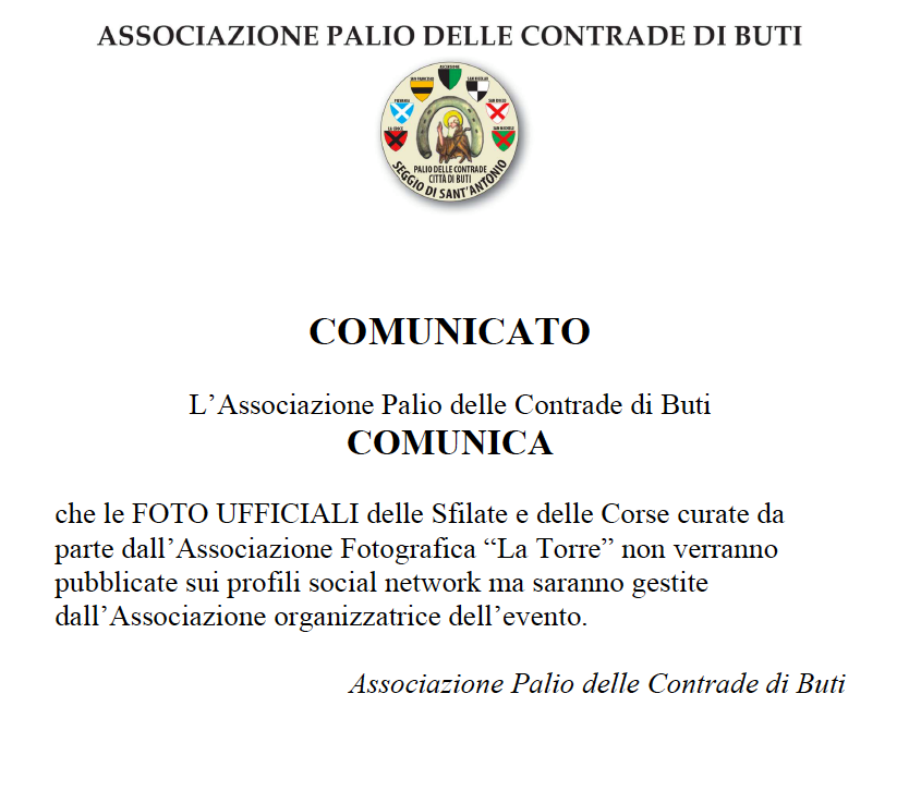 COMUNICA che le FOTO UFFICIALI delle Sfilate e delle Corse curate da parte dall’Associazione Fotografica “La Torre” NON verranno pubblicate sui profili social network ma saranno gestite dall’Associazione organizzatrice dell’evento.