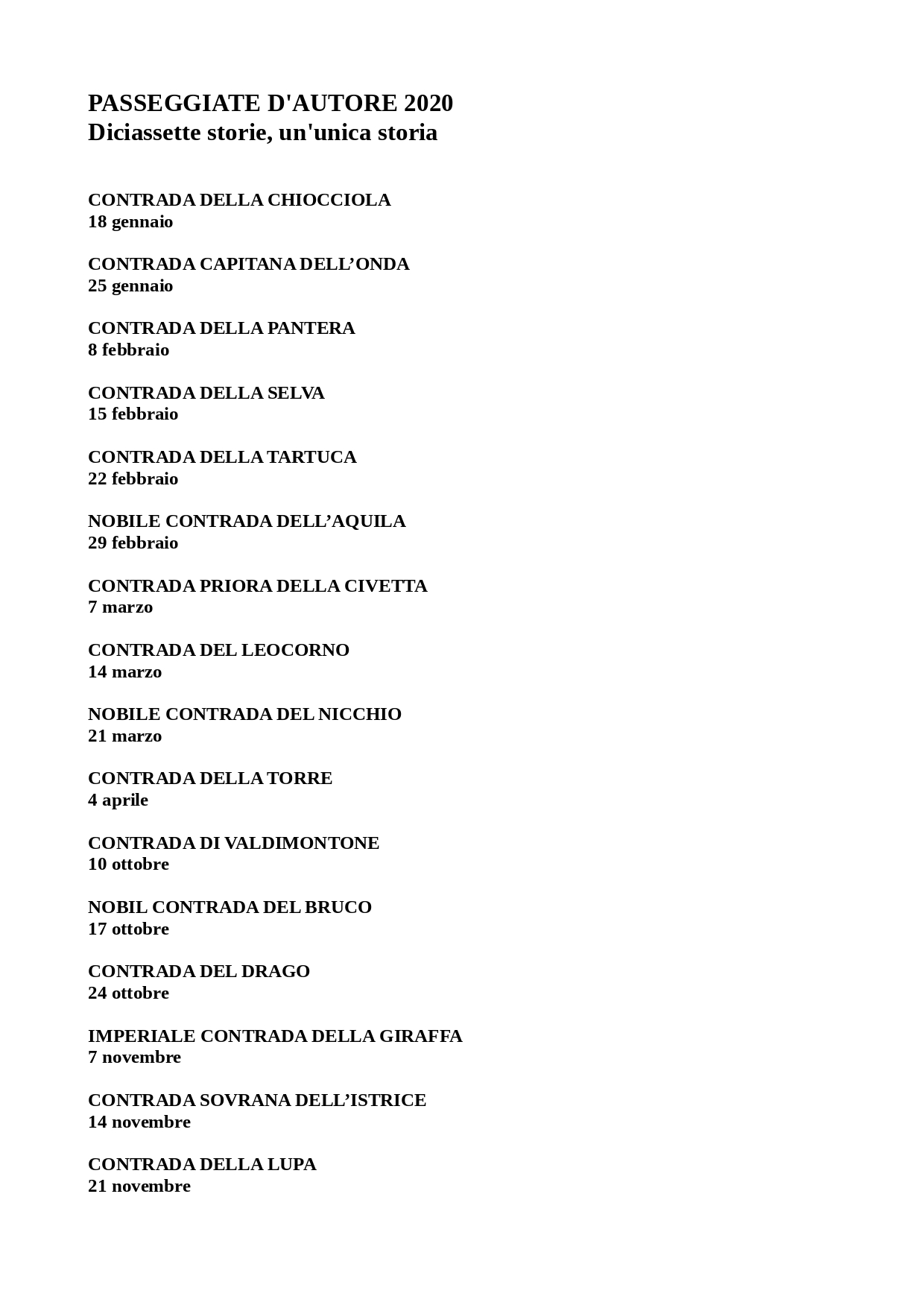 Passeggiate d’Autore nelle Contrade di Siena, itinerari per raccontare le strade, i vicoli, gli edifici, le antiche pietre dei rioni di Siena. Per ripercorrere la storia di quelle 17 “Repubbliche” che ancora nel terzo millennio esprimono vitalità, tramandano memoria e tradizioni, conservano tesori artistici, testimoniano umanità.
