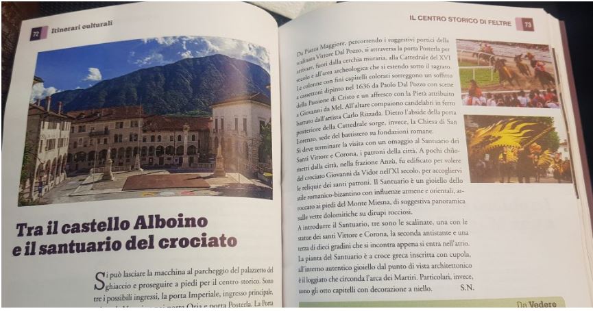 La sezione Itinerari culturali della stessa Guida, apre uno squarcio sulla bellezza del centro storico della città, dal Castello di Alboino al Santuario del Crociato, passando per i musei (Rizzarda e Civico). Quindi l’accenno al Parco Dolomiti di cui Feltre è capitale e le foto della gara dei cavalli del Palio che caratterizzano la storia della città antica legata a Venezia a doppio filo.