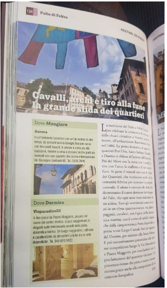 A pagina 134 Il Palio viene celebrato con una pagina di “Festival ed eventi”: nell’articolo si spiegano anche le origini della manifestazione, nata dalla consegna delle chiavi feltrine alla Serenissima. Foto e indicazioni sugli eventi illustrano i dettagli della kermesse feltrina. Uno splendido scorcio di piazza Maggiore sotto il drappo degli sbandieratori, offre un angolo suggestivo anche per gli occhi. Qualche suggerimento anche su ristoranti e posti letto.