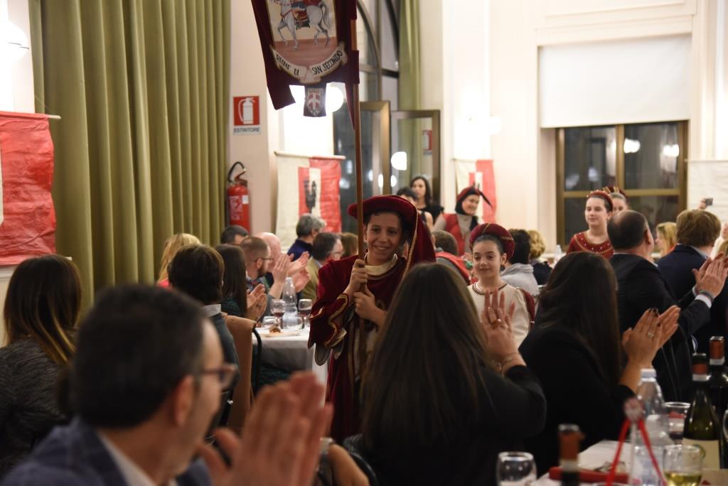 In un clima festoso e in una sala gremita, la serata è stata animata dalla presenza dei giovanissimi figuranti, musici e sbandieratori bianco rossi, che hanno sfilato tra i tavoli degli ospiti, riproponendo il tema vincitore.
