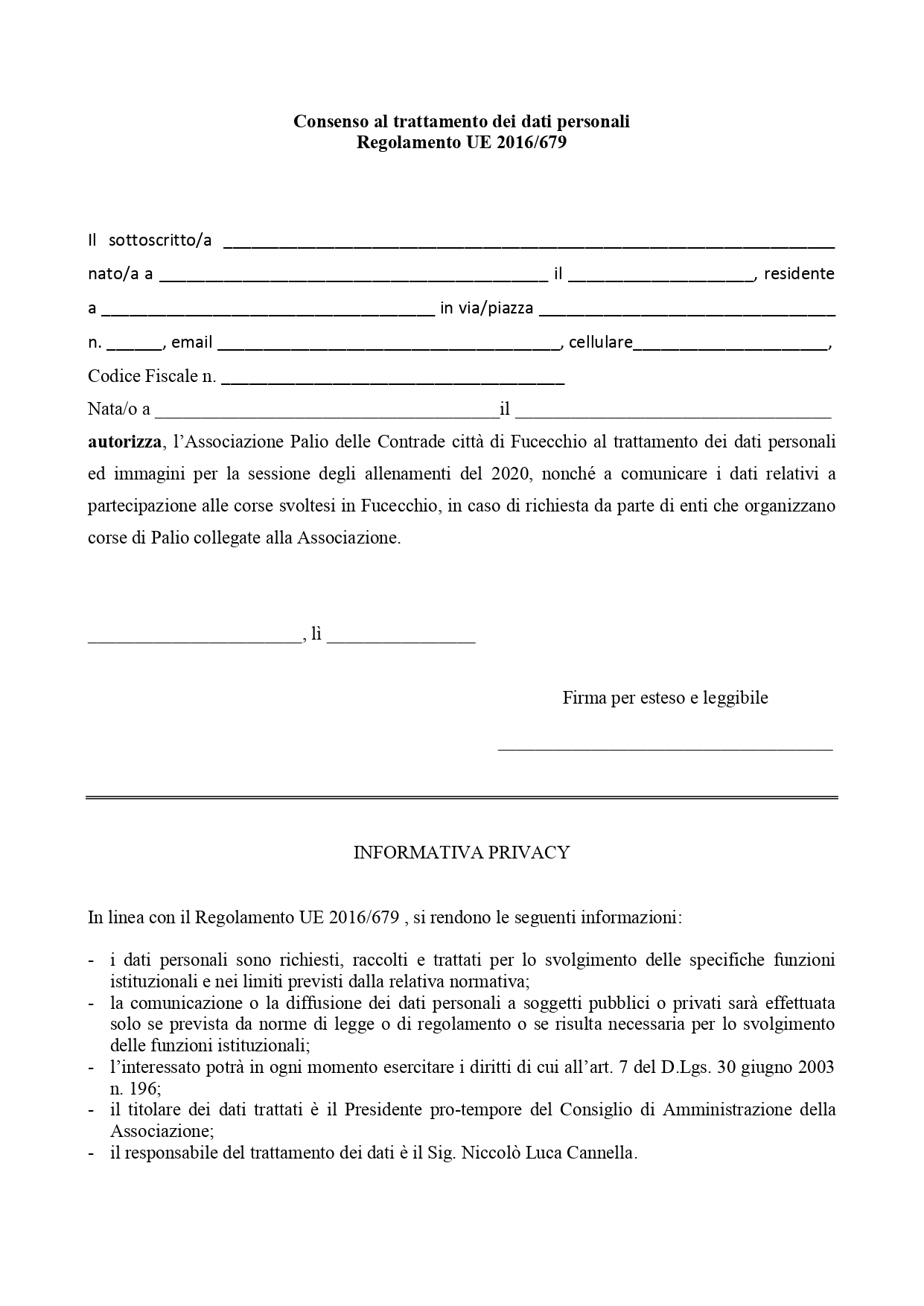 Consenso al trattamento dati personali maggiorenni per allenamenti