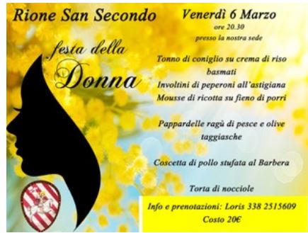 - Venerdì 06/03 alle 20,30 la Cena dedicata alla “Festa della Donna” .