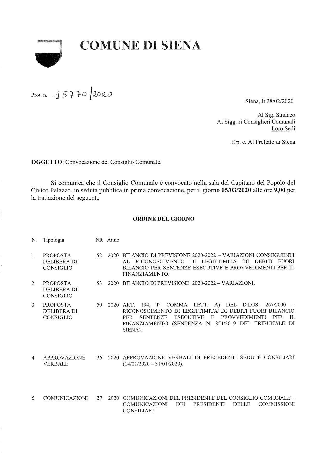 Giovedì prossimo, 5 marzo, a partire dalle ore 9, si terrà la seduta del Consiglio comunale nella Sala del Capitano del Popolo di Palazzo Pubblico.