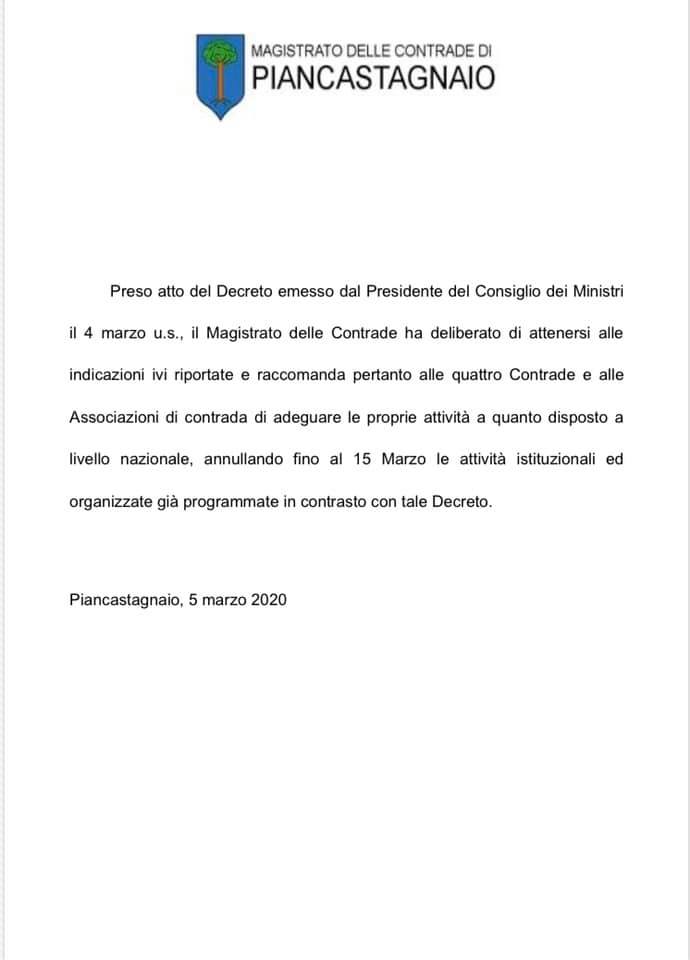 “Preso atto del Decreto emesso dal Presidente del Consiglio dei Ministri il 4 u.s, il Magistrato delle Contrade di Piancastagnaio ha deliberato di attenersi alle indicazioni ivi riportate e raccomanda pertanto alle 4 Contrade e alle Associazioni di Contrada di adeguare le proprie attività a quanto disposto a livello nazionale, annullando fino al 15 marzo le attività istituzionali e organizzate già programmate in contrasto con tale Decreto.”