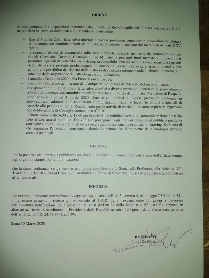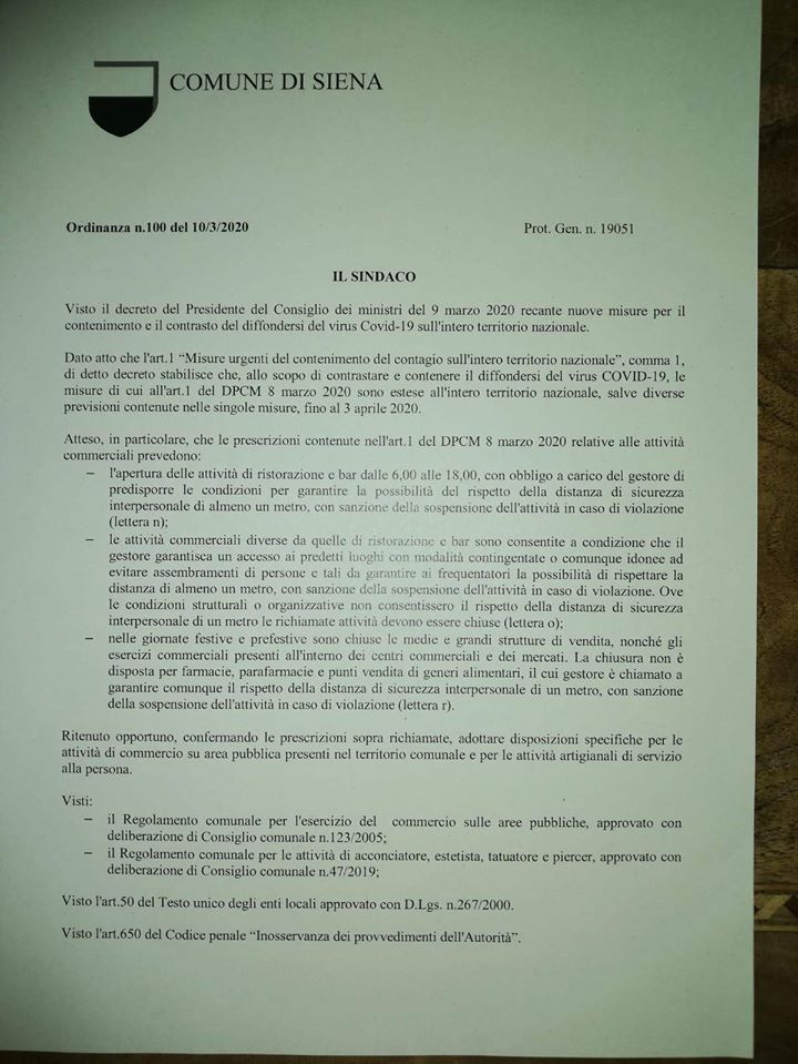 Con apposita ordinanza sindacale introdotte, da domani, 11 marzo, in ottemperanza alle disposizioni impartite con i Decreti della Presidenza del Consiglio dei Ministri dell’8 e 9 marzo, alcune limitazioni relative alle attività commerciali. Nello specifico, fino al prossimo 3 aprile, fatte salve ulteriori e diverse previsioni, è sospeso il mercato del mercoledì di viale XXV Aprile; la fiera denominata “Mercatino di Pasqua” e le attività artigianali di servizio alla persona: estetista, tatuatore e piercer. Consentiti, invece, i mercati rionali (Petriccio, Taverne, Costalpino, San Miniato), i posteggi fuori mercato e i mercati dei produttori agricoli di viale Maccari e di piazza Amendola, a condizione che i gestori predispongano le condizioni idonee per evitare assembramenti e garantire la possibilità del rispetto della distanza di sicurezza interpersonale di almeno un metro. Sospensione dell’attività in caso di violazione. Annullata l’edizione, in programma per questo mese di marzo, del mercatino dell’Antiquariato di piazza del Mercato e l’edizione della Fiera di San Giuseppe. Il limite orario dalle 6 alle 18 per le attività dei pubblici esercizi di somministrazione è riferito solo all’apertura al pubblico, l’attività può proseguire negli orari di chiusura mediante consegne a domicilio, per le quali dovrà essere stata presentata apposita scia di catering. Sarà cura di chi organizza l’attività di consegna a domicilio evitare che il momento della consegna preveda contatti personali. L’ordinanza è stata trasmessa alla Questura di Siena, alla Prefettura, alla Azienda USL Toscana Sud Est di Siena, al Comando Carabinieri di Siena, al Comando Polizia Municipale e ai competenti uffici comunali.