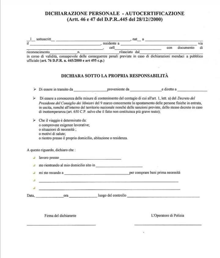 2.1 può scaricare due copie del modulo che può essere reperito all’indirizzo https://www.interno.gov.it/sites/default/files/allegati/modulo_autodichiarazione_10.3.2020.pdf compilarlo e, se fermato, farsi attestare il controllo, lasciandone una copia alle forze dell’ordine per l’eventuale verifica.