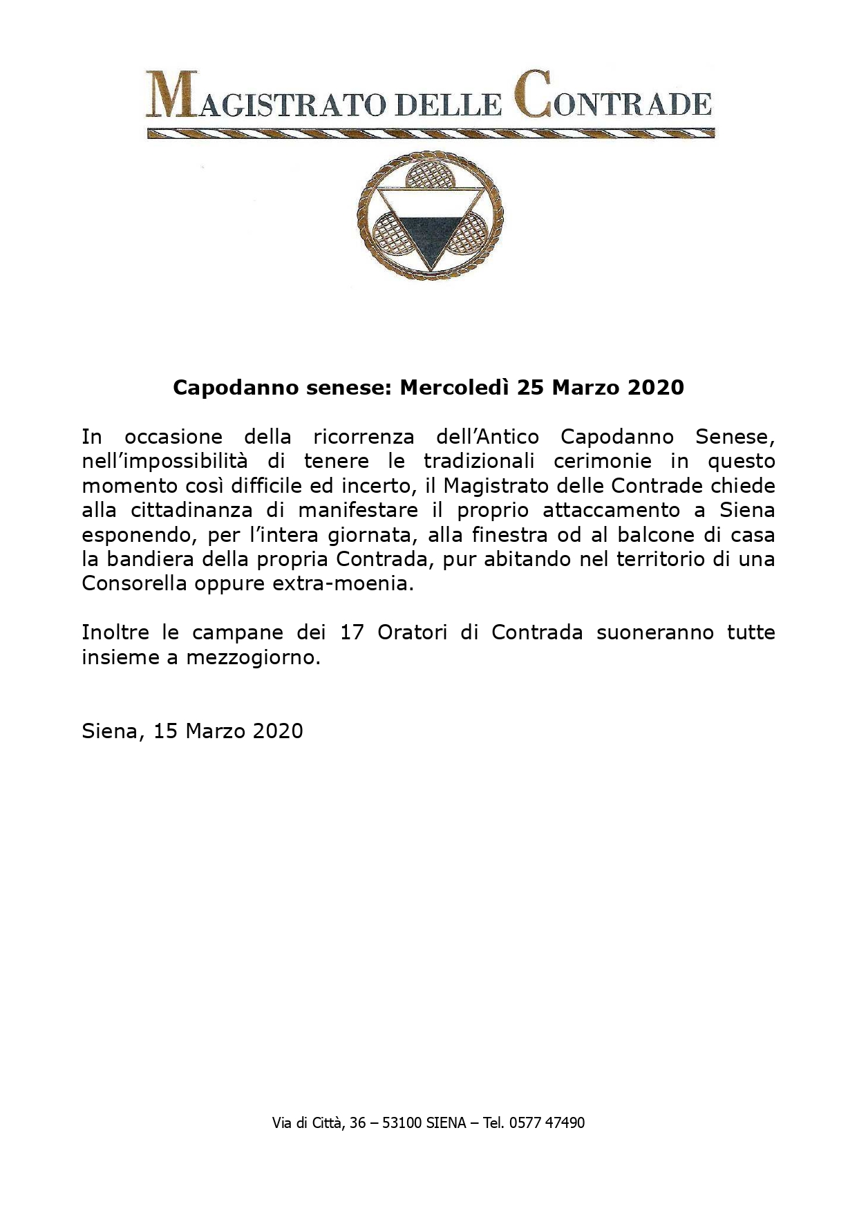 Oggi 25/03 è il Capodanno Senese. Auguri Siena. Il Magistrato delle Contrade ricorda di esporre per questa giornata le bandiere ai porta bandiera delle case di tutti i senesi.