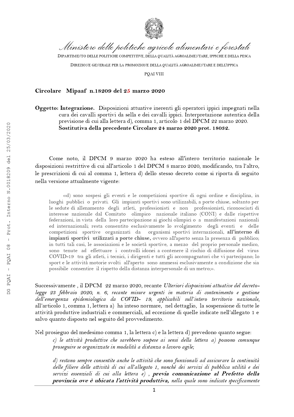 Oggetto:Integrazione. Disposizioni attuative inerenti glioperatori ippici impegnati nella cura dei cavalli sportivida sellae dei cavalli ippici. Interpretazione autentica della previsione di cui alla lettera d), comma 1, articolo 1 del DPCM 22 marzo 2020.