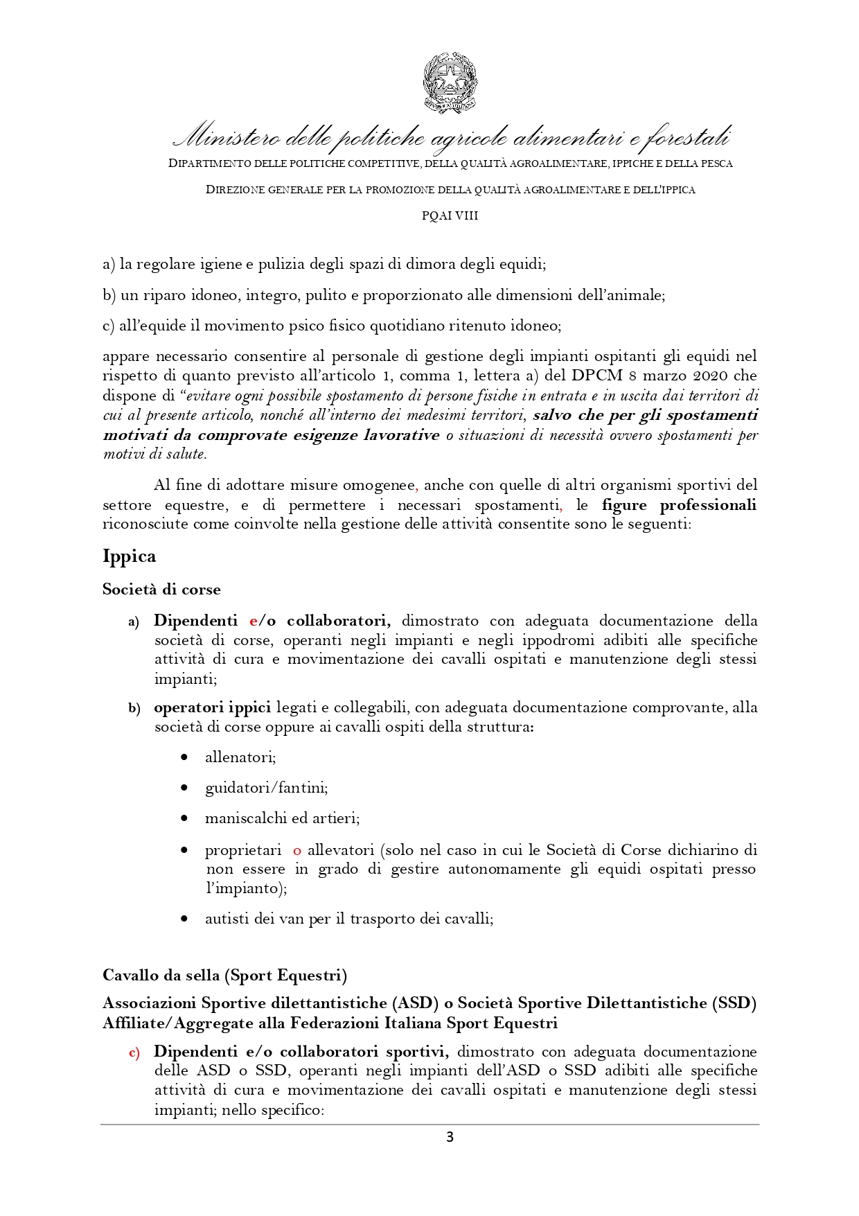 - PQAIVIII3a) la regolare igiene e pulizia degli spazi di dimora degli equidi; b) un riparo idoneo, integro, pulito e proporzionato alle dimensioni dell’animale; c) all’equide il movimentopsico fisico quotidiano ritenuto idoneo;appare necessario consentire alpersonale di gestione degli impianti ospitanti gli equidi nel rispetto di quanto previsto all’articolo 1, comma 1, lettera a) del DPCM 8 marzo 2020 che dispone di “evitare ogni possibile spostamento di persone fisiche in entrata e in uscita dai territori di cui al presente articolo, nonché all’interno dei medesimi territori, salvo che per gli spostamenti motivati da comprovate esigenze lavorativeo situazioni di necessità ovvero spostamenti per motivi di salute.Al fine di adottaremisure omogenee, anche con quelle dialtri organismi sportivi del settoreequestre,edi permettere i necessari spostamenti,le figure professionaliriconosciute come coinvoltenella gestione delle attività consentitesono le seguenti:IppicaSocietà di corsea)Dipendenti e/o collaboratori,dimostrato con adeguata documentazionedella società di corse,operanti negli impianti e negli ippodromi adibiti allespecifiche attività di curae movimentazione dei cavalli ospitatie manutenzione degli stessiimpianti;b)operatori ippici legati e collegabili,con adeguata documentazione comprovante,alla società di corse oppure ai cavalli ospitidella struttura:allenatori; guidatori/fantini; maniscalchied artieri;proprietari o allevatori(solo nel caso in cui le Società di Corse dichiarino di non essere in grado di gestire autonomamente gli equidi ospitati presso l’impianto);autisti dei van per il trasporto dei cavalli;Cavallo da sella (Sport Equestri)Associazioni Sportive dilettantistiche (ASD) o Società Sportive Dilettantistiche (SSD) Affiliate/AggregateallaFederazioniItaliana Sport Equestric)Dipendentie/o collaboratorisportivi,dimostrato con adeguata documentazionedelle ASD o SSD,operanti negli impiantidell’ASD o SSDadibitialle specifiche attività di cura e movimentazione dei cavalli ospitati e manutenzione degli stessi impianti;nello specifico: