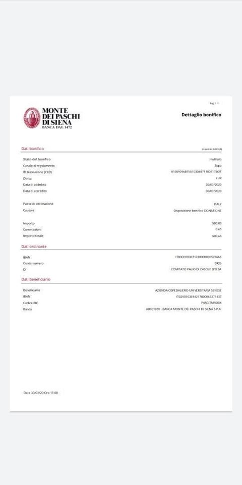 Palio di Casole d’Elsa, Comitato Palio: Oggi 30/03 Il Comitato ha donato 500 euro alla terapia intensiva dell’ospedale le Scotte di Siena