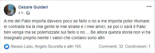 “A me del Palio importa davvero poco se farlo o no a me importa poter ritornare in contrada tra la mia gente le mie strade e i miei amici, se poi ci sarà il Palio ben venga ma se polemizzate sul farlo o no…. Be allora questa storia non vi ha insegnato proprio niente I valori che contano sono altri.”