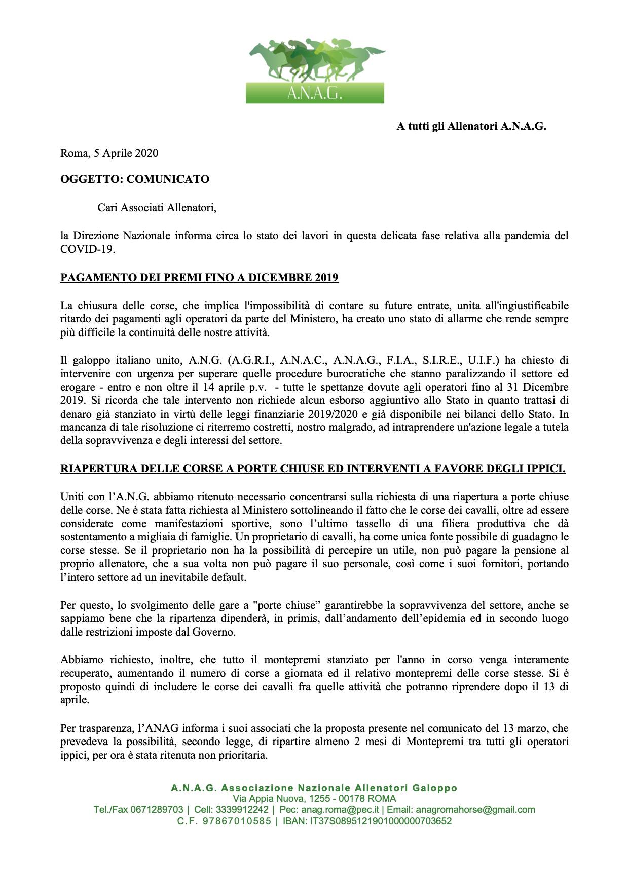 Poiché l’ANAG ha a cuore i diritti degli Allenatori, ci tiene a ribadire che la nostra figura professionale avrebbe dovuto avere un aiuto per sopravvivere, così come tutte le altre figure presenti nell’intera filiera ippica e che è inaccettabile che la manovra economica non includa il nostro comparto.”