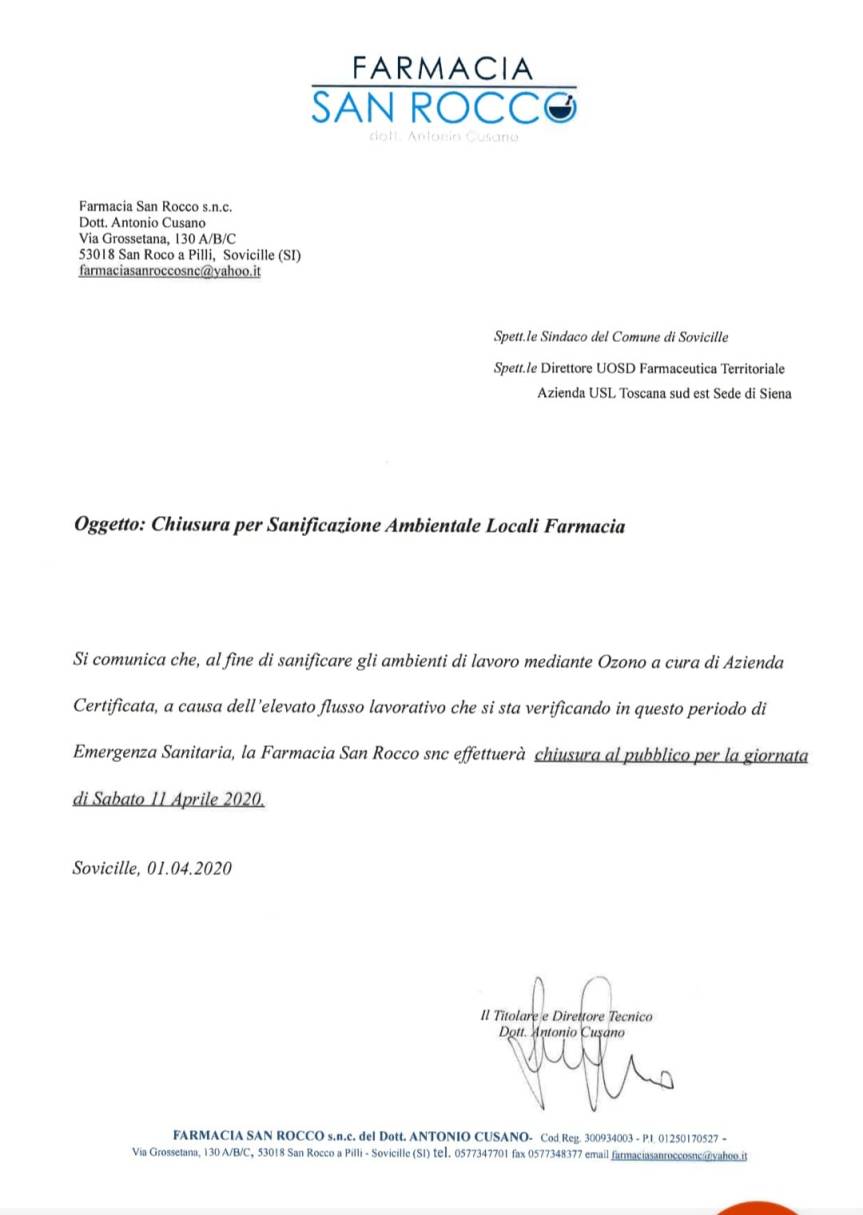 Si comunica che, alfine di sanificare gli ambienti di lavoro mediante Ozono a cura di Azienda Certificata, a causa dell ‘elevato flusso lavorativo che si sta verificando in questo periodo di Emergenza Sanitaria, la Farmacia effettuerà chiusura al Pubblico per la giornata di SABATO 11 APRILE.