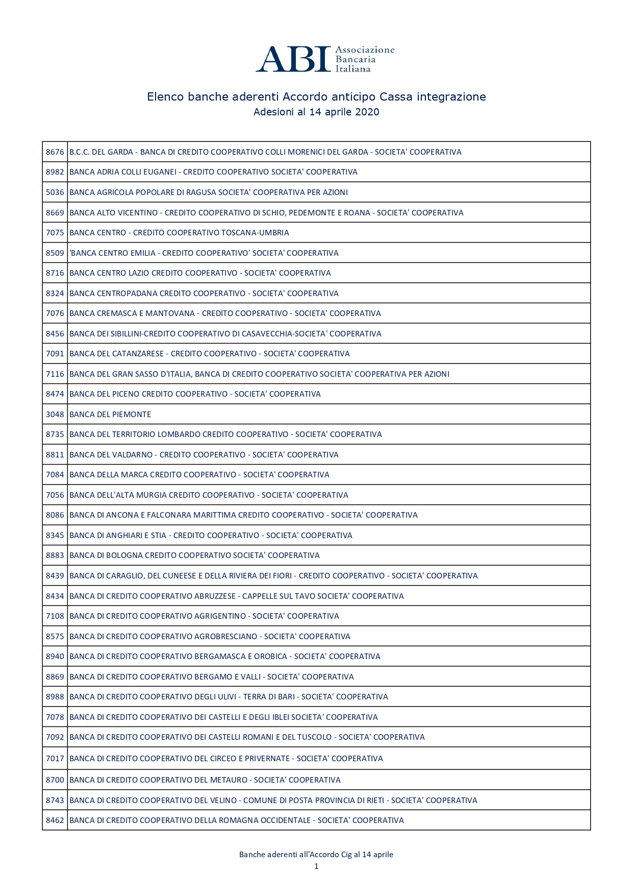 Qua sotto troverete l’elenco aggiornato a oggi 21/04 delle banche convenzionate per l’anticipo della cassa integrazione alle aziende