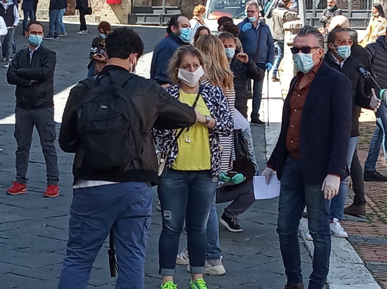Oggi 29/04 si sono dati appuntamento in Piazza del Campo ristoratori e negozianti senesi per una pacifica protesta, effettuata in pieno rispetto delle norme anti Coronavirus, con mascherine e distanziamento sociale, per protestare contro le cervellotiche decisioni e norme contenute nel Dcpm Conte emanato sabato 26/04.