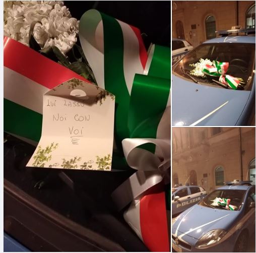 “Lui lassù, Noi con Voi. Quale frase potrebbe esprimere meglio l’affetto e la vicinanza dei cittadini a tutta la famiglia della Polizia di Stato? Questo è il gesto di solidarietà di chi, rimasto anonimo, ieri ha lasciato un mazzo di fiori sul parabrezza della Volante davanti al Commissariato PS di Poggibonsi. Un gesto simbolico, commovente, in memoria di chi ha sacrificato la propria vita nell’adempimento del dovere, come il nostro collega Pasquale Apicella. Caro cittadino/a anche Noi siamo con Voi, è la nostra missione…quella in cui anche Pasquale credeva. Grazie!”