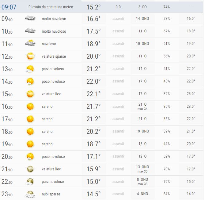 “A Siena oggi giornata in prevalenza poco nuvolosa, salvo presenza di nubi sparse al mattino, non sono previste piogge nelle prossime ore. Durante la giornata di oggi la temperatura massima registrata sarà di 22.1°C, la minima di 14°C, lo zero termico si attesterà a 2701m. I venti saranno al mattino deboli e proverranno da Est-Sudest, al pomeriggio moderati e proverranno da Ovest. Nessuna allerta meteo presente.