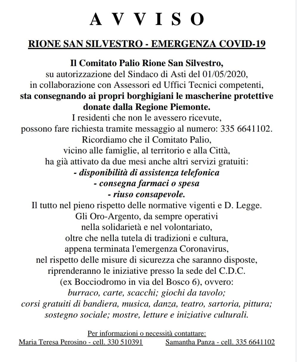 A San Silvestro abbiamo terminato la distribuzione delle mascherine protettive donate dalla Regione Piemonte nella zona di corso Dante, via Testa, via Hope, via Zangrandi, via al Castello, via del Soccorso, via De Amicis, via Orfanotrofio, via Morelli, via Cesare Battisti, piazza Medici. Domani proseguiamo con le altre vie… I volontari del mondo del Palio sono una risorsa. Oggi, giorno in cui avremmo dovuto avere la Stima e il Giuramento dei Rettori, abbiamo reso onore alle nostre tradizioni, alla nostra storia e alla città con un gesto simbolico ma utile.”