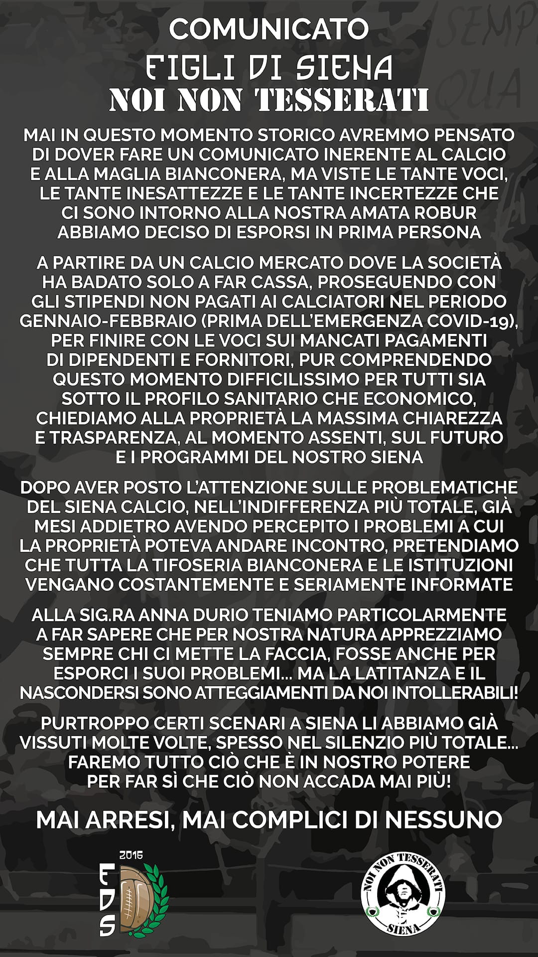 Qua sotto vi riporto il Comunicato Stampa redatto oggi 03/05 dai “Figli di Siena” e da “Noi Non Tesserati” sulla situazione societari della Robur Siena