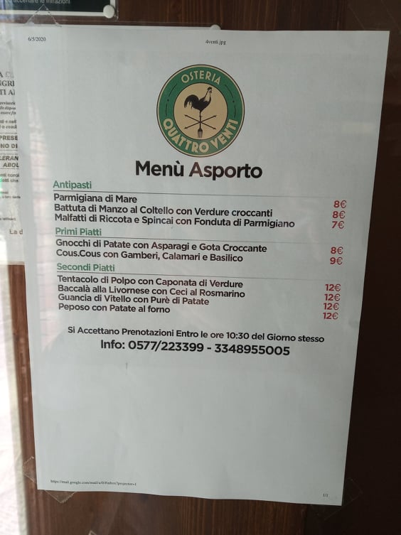 Fabiano, proprietario dell’Osteria mi comunica che da oggi 06705, più precisamente dal servizio di cena di stasera, l’Osteria è aperta con servizio asporto. Vengono accettate prenotazioni entro le ore 10.30 del giorno stesso in cui desiderate prenotare le pietanze del Menù. Info: