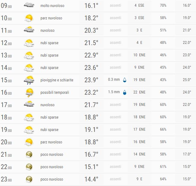 “A Siena oggi nubi in progressivo aumento con piogge e rovesci anche a carattere temporalesco nel pomeriggio. schiarite in serata, sono previsti 1.8mm di pioggia nelle prossime ore. Durante la giornata di oggi la temperatura massima registrata sarà di 23.9°C, la minima di 12.9°C, lo zero termico si attesterà a 3042m. I venti saranno al mattino deboli e proverranno da Nord-Nordest, al pomeriggio deboli e proverranno da Est. Nessuna allerta meteo presente.