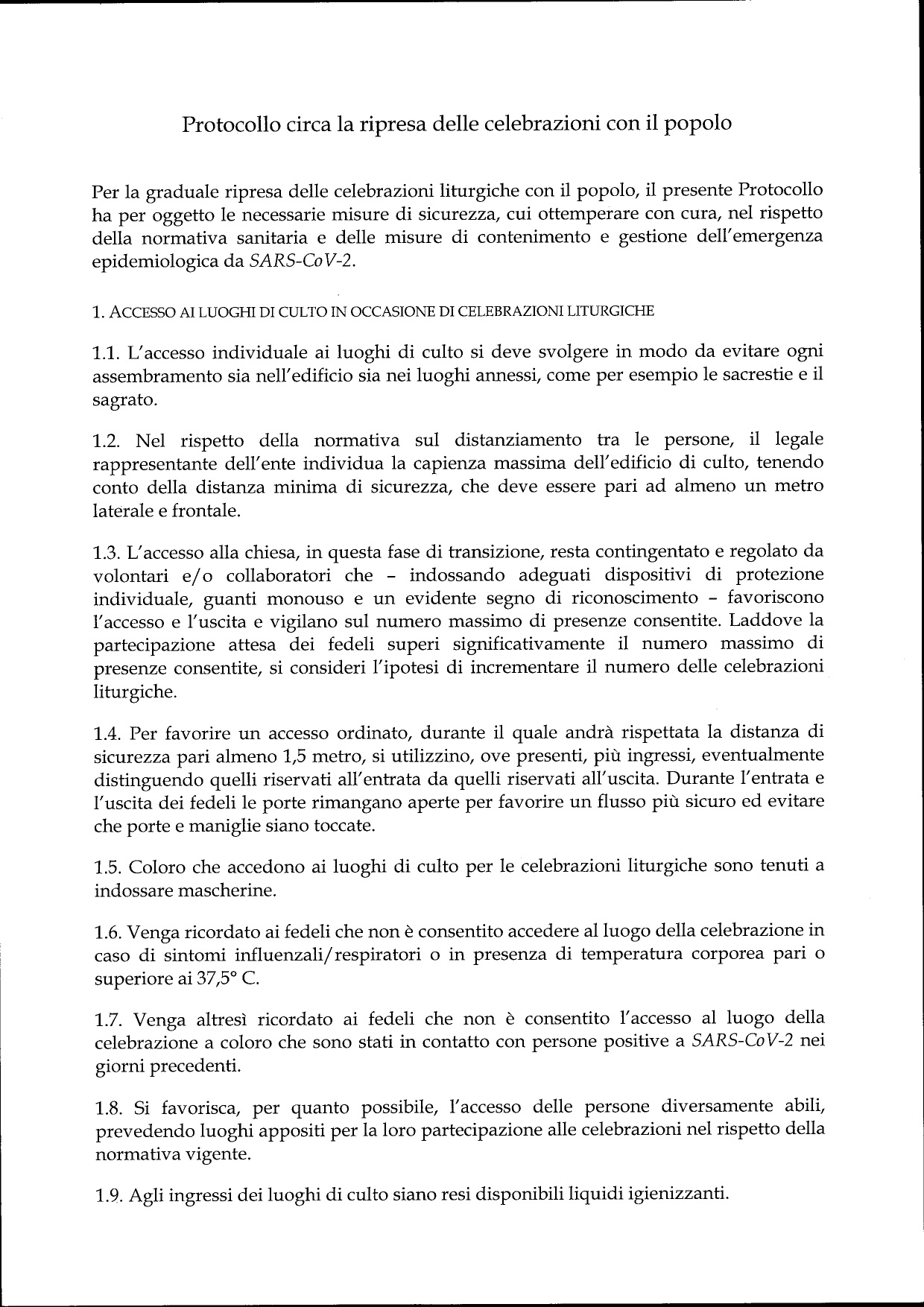 “Le misure di sicurezza previste nel testo – ha sottolineato il Presidente Conte – indicano le modalità più idonee per assicurare che la ripresa delle celebrazioni liturgiche avvenga nella maniera più sicura per la salute pubblica e per la tutela protezione dei fedeli. Ringrazio la CEI per il sostegno morale e materiale che sta offrendo alla collettività nazionale in questo momento così difficile per il Paese”.