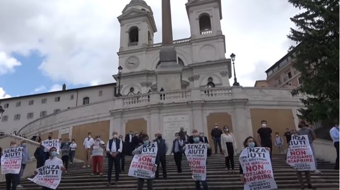 “Il 18 non apriremo per protesta: serve un piano di lungo respiro, altrimenti ci faranno morire lentamente”. Hanno scelto la scalinata di Trinità dei Monti per far sentire la loro voce gli oltre 200 imprenditori, tra negozianti, albergatori e mediatori immobiliari, in protesta contro il governo e il Comune di Roma. “Chiediamo misure concrete – dice David Meyer Naman, titolare di 400 punti vendita in Italia nei quali lavorano 200 dipendenti – servirebbe la decontribuzione degli stipendi, la convertibilità dei crediti di imposta a carico dei lavoratori”. Chiedono finanziamenti a fondo perduto, delle agevolazioni sui canoni di affitto. “A Roma è necessario aprire immediatamente la zona a traffico limitato (Ztl) del centro storico – aggiunge Antonio Taddei, titolare di otto punti vendita da via dei Giubbonari al rione Prati – ci attende un calo del giro d”affari dell”80 per cento: i turisti non ci sono. Non è pensabile immaginare che i romani arrivino dalle periferie in bicicletta come afferma la sindaca Raggi”. . .di Cristina Pantaleoni e Luca Monaco