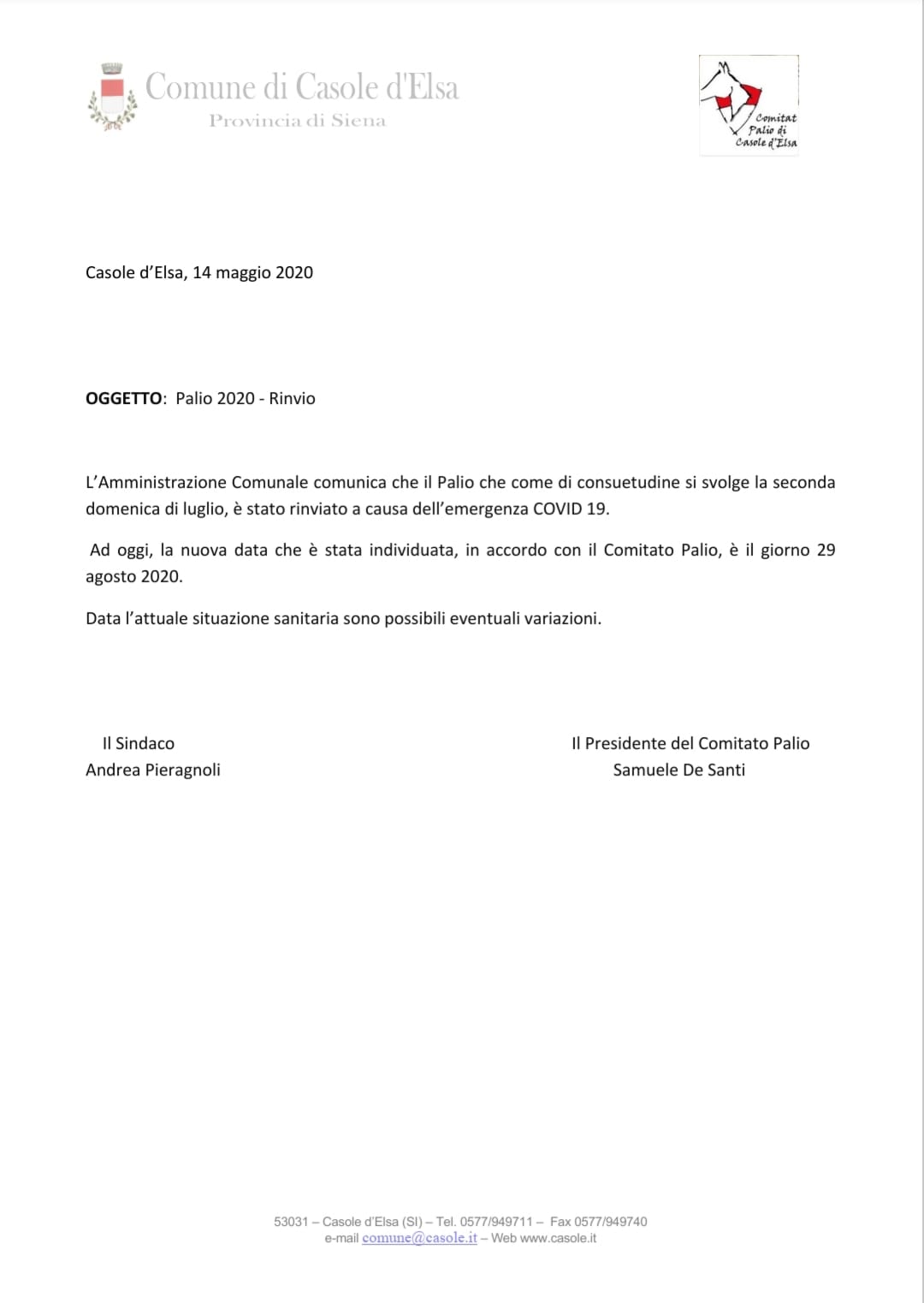 “L’Amministrazione Comunale comunica che il Palio che come di consuetudine si svolge la seconda domenica di Luglio, è stato rinviato a causa dell’emergenza COVID 19.