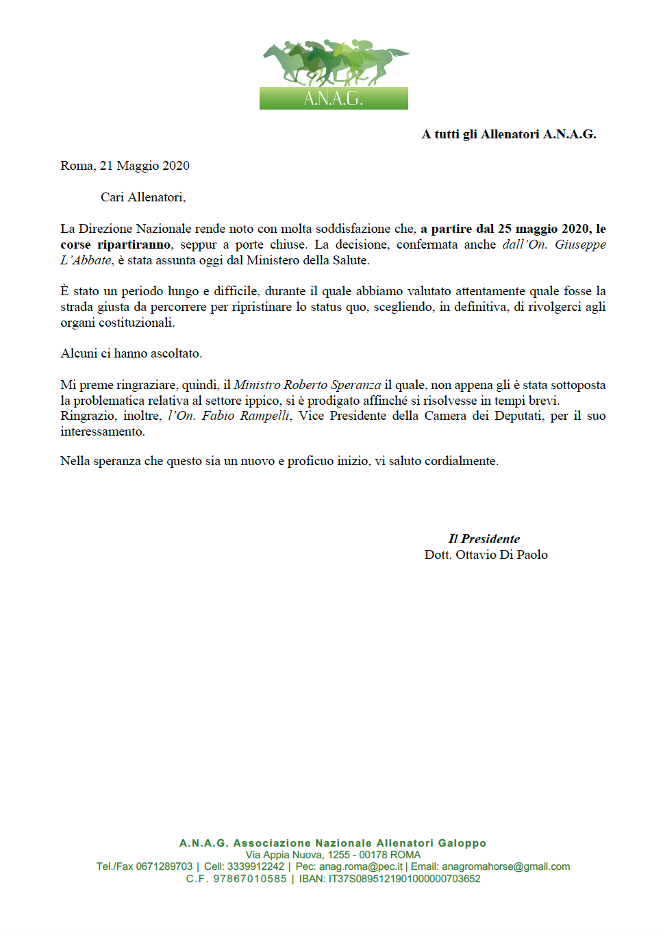 Mi preme ringraziare, quindi, il Ministro Roberto Speranza il quale, non appena gli è stata sottoposta la problematica relativa al settore ippico, si è prodigato affinché si risolvesse in tempi brevi.Ringrazio, inoltre, l’On. Fabio Rampelli, Vice Presidente della Camera dei Deputati, per il suo interessamento.