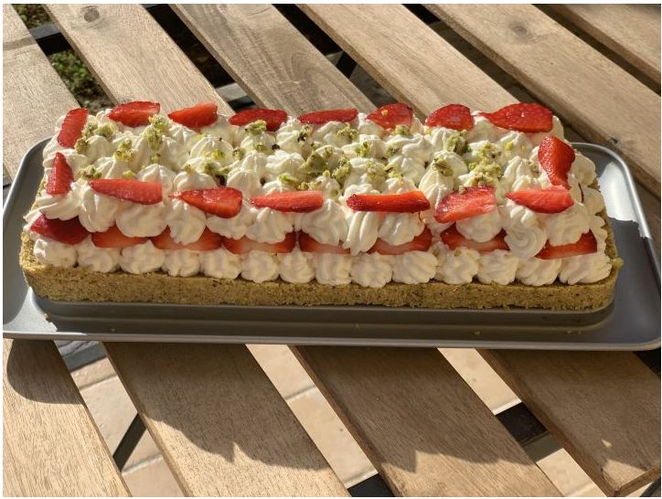 - Tirare fuori la base dal freezer e iniziare , con l’aiuto di una sacca da pasticcere, a formare il primo strato, aggiungere poi uno strato di fragole e continuare finendo con l’ultimo strato di crema e decorare così la nostra torta fredda fragole e pistacchio di bronte sarà pronta per essere gustata