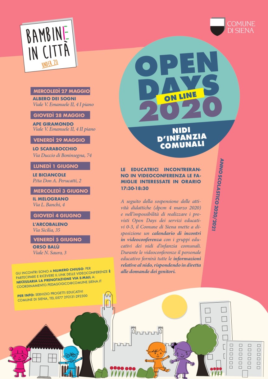 A seguito della sospensione delle attività didattiche per l’emergenza sanitaria da Covid-19 e nell’impossibilità di realizzare i previsti Open Day nei nidi d’infanzia comunali, il Comune ha predisposto una serie di incontri da effettuare in videoconferenza dal 27 maggio al 5 giugno.