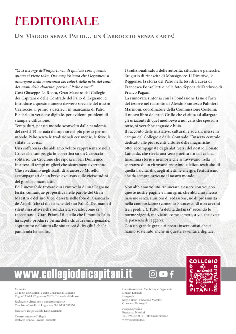 Esce Il Carroccio, con un numero dedicato principalmente a quanto messo in campo dal Collegio, in quest’anno “senza Palio” ma con tante iniziative a fianco della comunità in momenti particolarmente difficili. La parola al Gran Maestro e al suo Vice, ai Gran Priori; la presentazione del Direttivo, delle Reggenze di Contrada e una serie di immagini storiche e di attualità; lo speciale fotografico sulle più recenti vittorie delle otto sorelle; un approfondimento (storico e fotografico) sulla Croce di Ariberto.