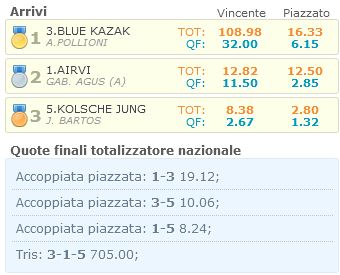 4^ Corsa Premio Scena vinta da Blue Kazak. In questa corsa da registrare la vittoria per Alessio Pollioni, giovane fantino passato anche dal circuito del Palio di Siena, bella vittoria a alta quota al totalizzatore ( 108.98 sul vincente ) per Alessio e Blue Kazak