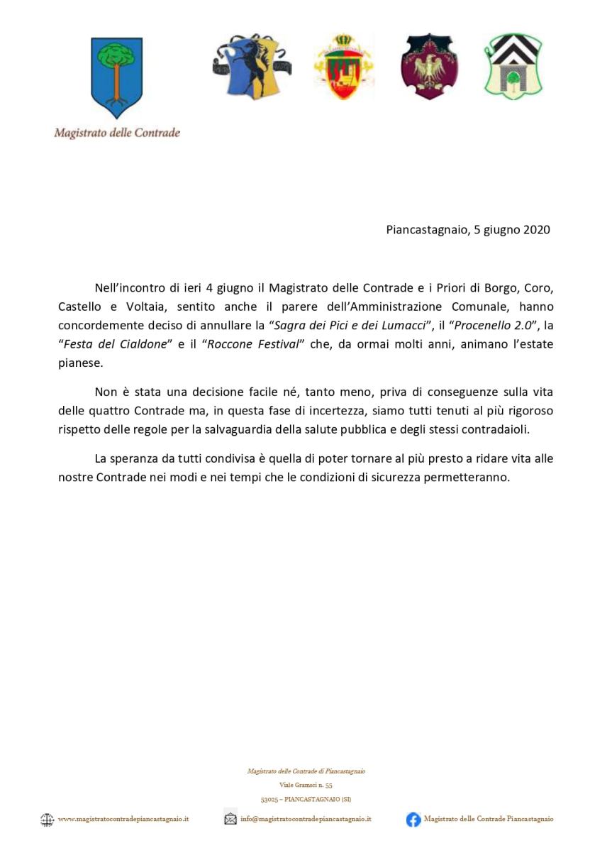 Comunicato congiunto del Magistrato delle Contrade e delle Contrade di Borgo, Castello, Coro e Voltaia sull’annullamento degli eventi del mese di luglio 2020.