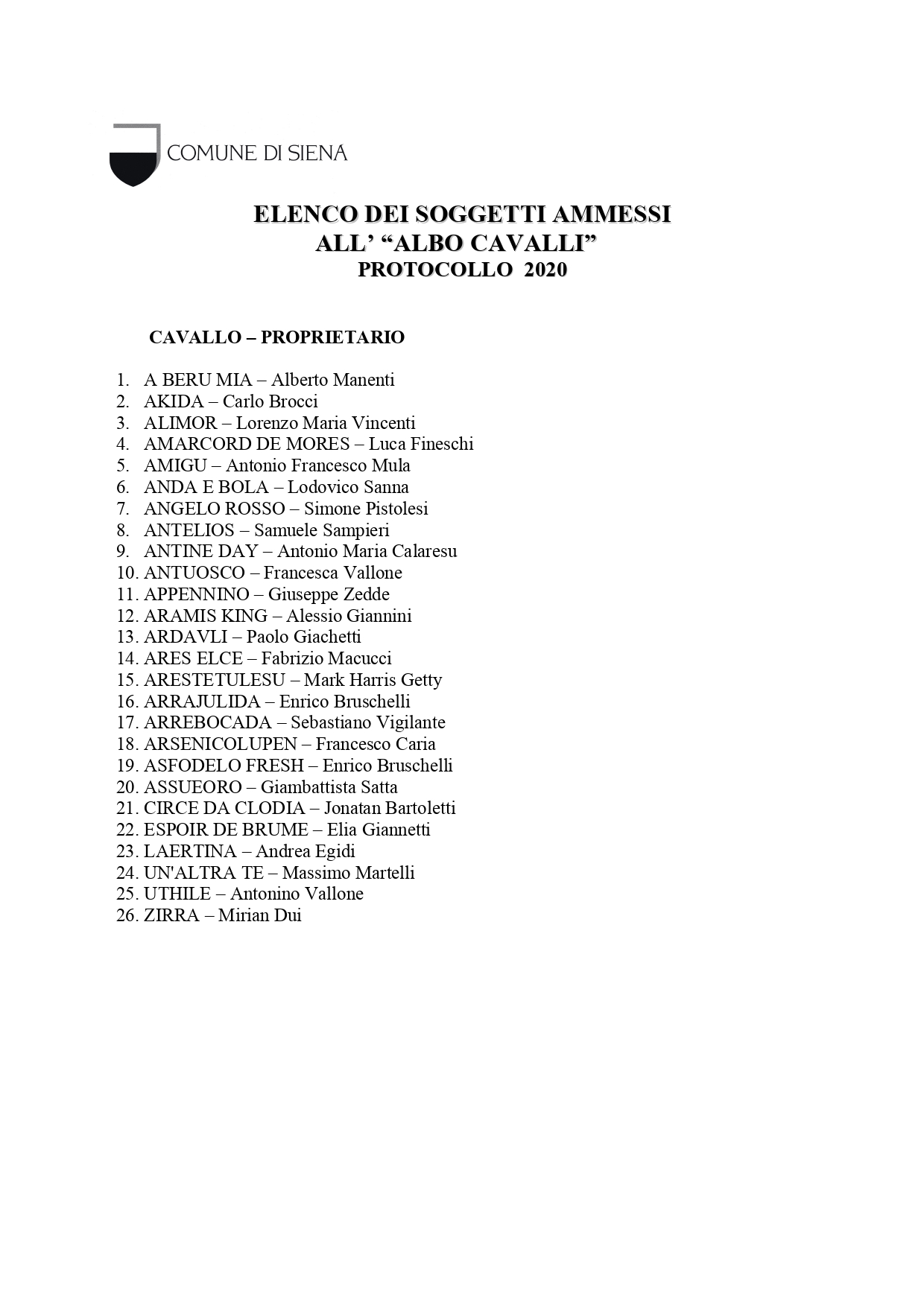 Di seguito l’elenco dei 26 soggetti ammessi all’ “Albo Cavalli” Protocollo 2020dopo le visite avvenute lo scorso 21 giugno nella clinica veterinaria “Il Ceppo”, in località Monteresi (Monteriggioni).