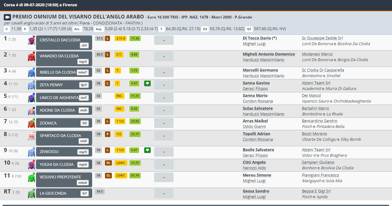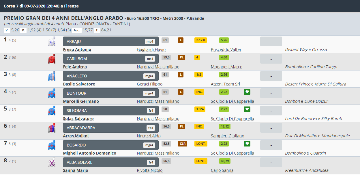 Oggi 09/07 grande ippica per gli Anglo-Arabi in quel del Visarno a Firen<e. Erano in programma due Corse per Anglo-Arabi, L’Omnium del Visarno e Il Gran premio dell’Anglo-Arabo. L’Omnium è statoi vinto dal cavallo Cristallo da Clodia da Lord de Bonorva e Bosilvia da Clodia di proprietà di Sc Giuseppe Zedde Srl, allenato da Migheli Luigi e montato da Dario di Tocco