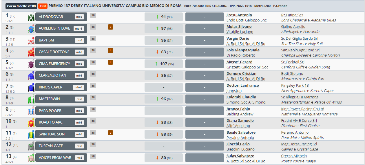 Oggi 12/07 sulla pista dell’Ippodromo delle Capannelle a Roma di disputa il 137° Derby italiano. una corsa affasciante dove si sifideranno in 13 fra i migliori galoppatori al mondo. la Corsa sarà l’ottava del convegno, con i cavalli chiamati alle gabbie alle ore 20.00 circa. Qua sotto i partenti