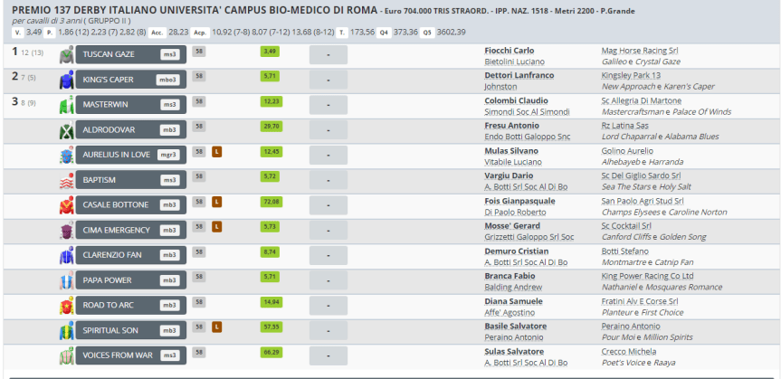 Oggi 12/07 sulla pista dell’Ippodromo di Capannelle a Roma si è corso il 137° Derby italiano. lo ha vinto a fil di palo il cavallo Tuscan Gaze da Galileo e Cristal Gaze di proprietà di Mag Horse Racing Srl, ìallenato da Bietolini Luciano e e montato alla perfezione da Fiocchi Carlo. La vittoria di Tuscan gaze si concretizza a fil di palo stampando proprio sul palo il cavallo King’s Caper montato da Dettori Lanfranco, che in retta aveva tentato di staccare per vincere. Una corsa avvincente veramente, con un finale da batticuore.