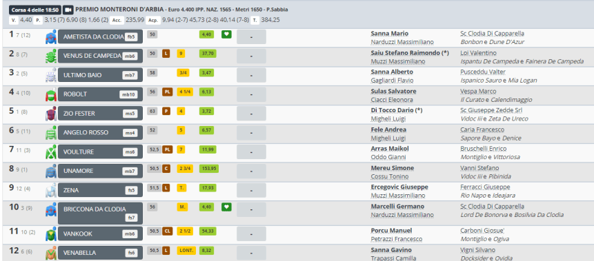 Oggi 17/07 a Follonica si sono svolte tre corse per cavalli Anglo-Arabi. La quarta corsa Premio Monteroni d’Arbia è stata vinta da Ametista da Clodia da Bonbon e Dune d’Azur, di proprietà di Sc Clodia di Capparella A. Srls, allenato da Narduzzi Massimiliano e montato da Sanna Mario.