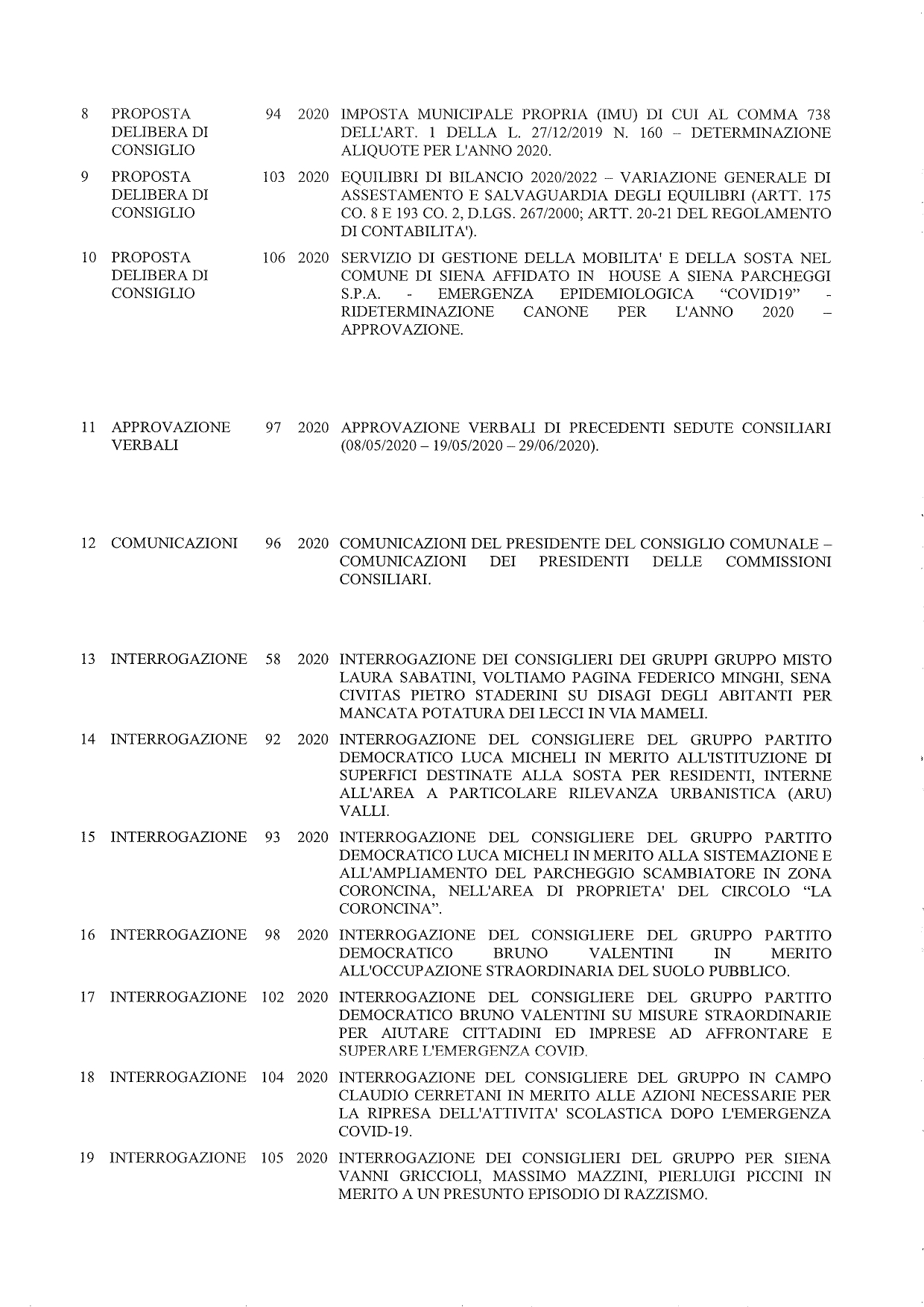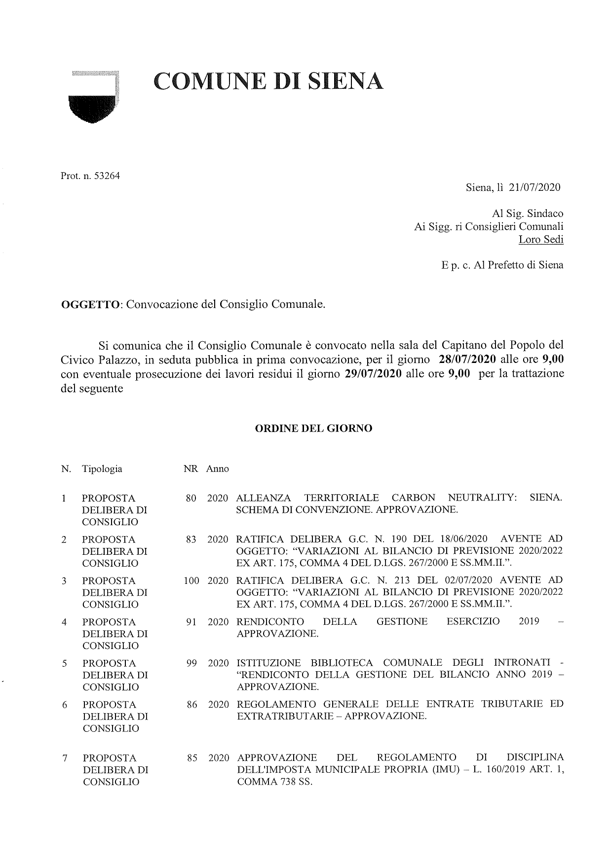 Martedì prossimo, 28 luglio, a partire dalle ore 9, si terrà la seduta del Consiglio comunale nella Sala del Capitano del Popolo di Palazzo Pubblico, con eventuale prosecuzione dei lavori residui al giorno successivo alla stessa ora.