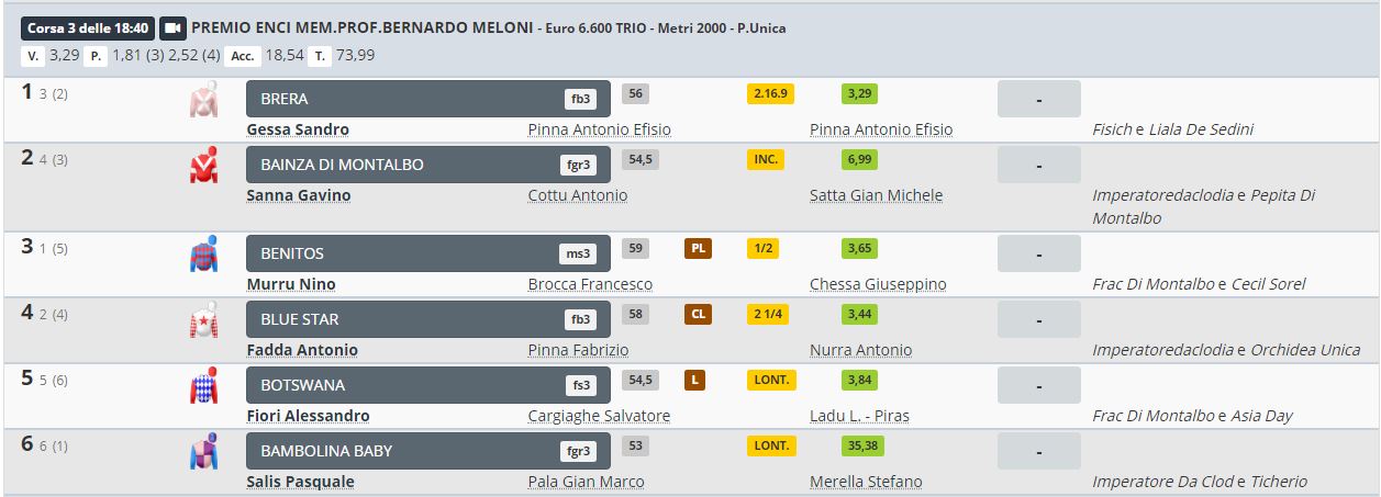 Oggi 06/08 all’Ippodromo Pinna di Sassari si è svolto un convegno di corse di galoppo. Nelle corse riservate ai Cavalli Anglo-Arabi, la 3^ Corsa è stata vinta dal cavallo Brera ( da Fisich e Laila de Sedini, di proprietà di Pinna Antonio Eflisio, allenato da Pinna Antonio Efisio e montato da Gessa Sandro. Qua sotto i risultati e le quote