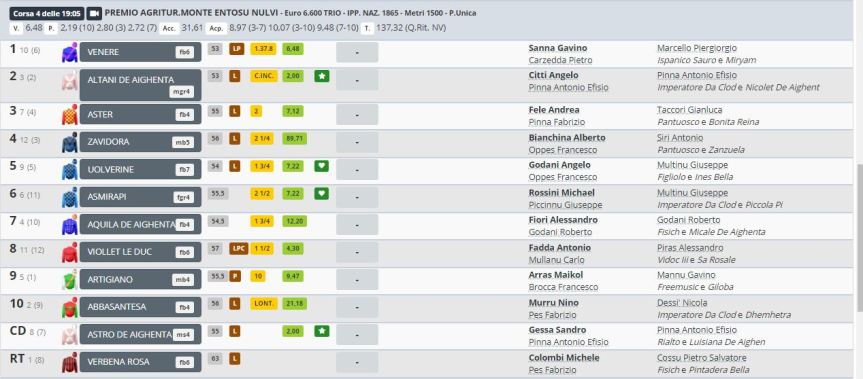 La quarta Corsa è stata vinta da Venere ( da Ispanico Sauro e Miryam, di proprietà di Marcello Piergiorgio, allenato da Carzedda Pietro e montato da Sanna Gavino). Qua sotto risultati e quote