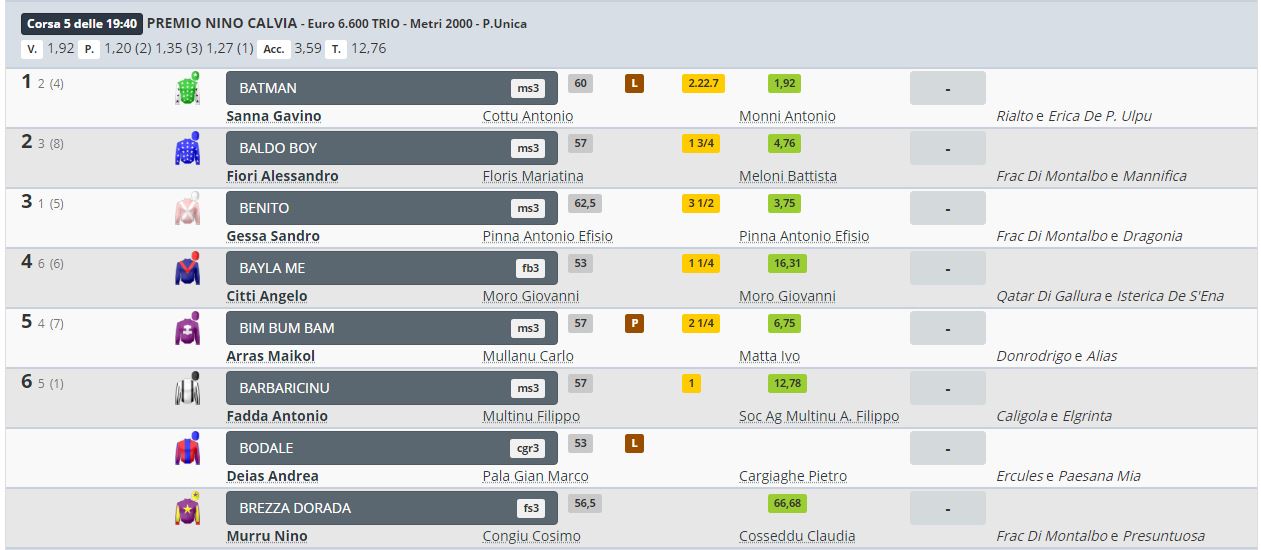La quinta corsa è stata vinta da Batman ( da Rialto e Erica de P. Ulpu, di poprietà di Monni Antonio, allenato da Cottu Antonio e montato da Sanna Gavino ). Qua sotto risultati e quote