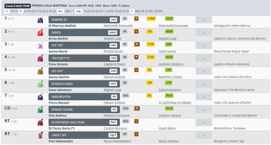 La 6ì Corsa è stata vinta da Sempre Io ( da Mangayoh e Mere Manna, di proprietà di Mancinelli Emanuele, allenato da mancinelli Emanuele e montato da El Rherras Abdilah ). Qua sotto risultati e quote
